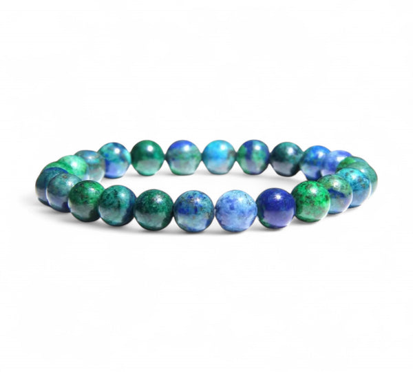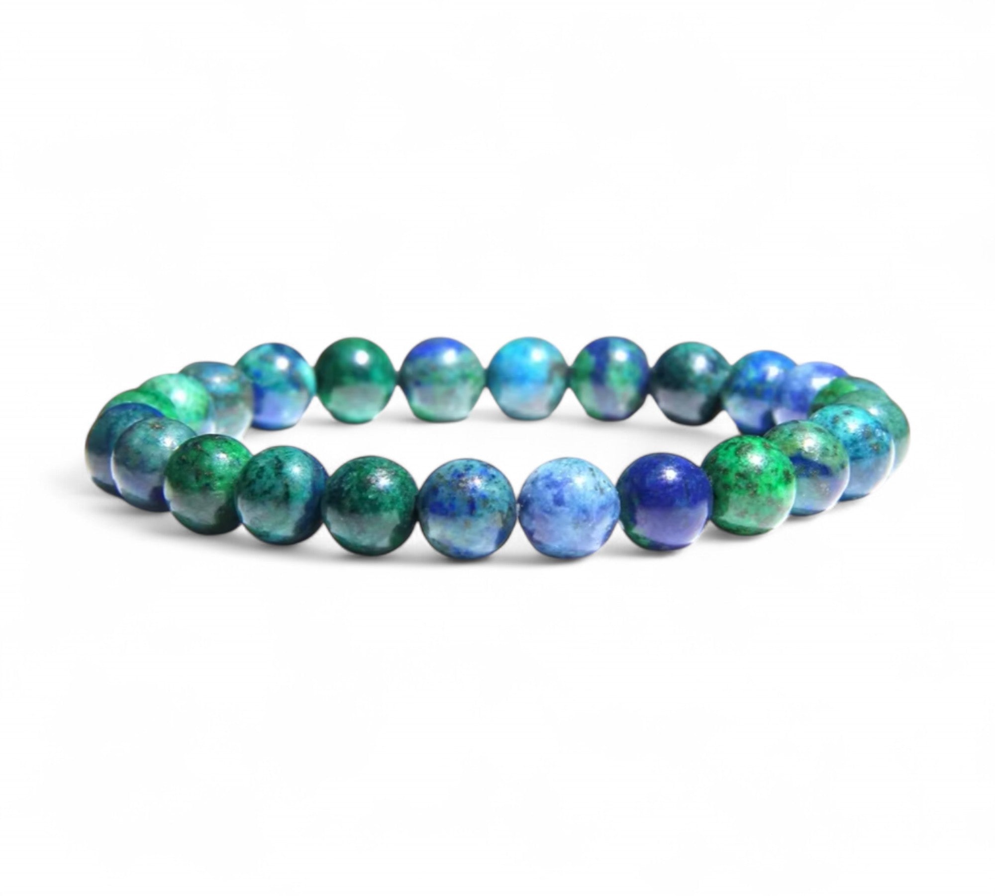 A ritka és különleges shattuckit – más néven sattukit – az önkifejezés, intuíció és spirituális tisztulás ásványa. Ez a 6 mm-es, csodás kék és zöld tónusokkal játszó golyókból álló karkötő nemcsak esztétikailag lenyűgöző, hanem mély, belső munkát segítő energiákat is hordoz.