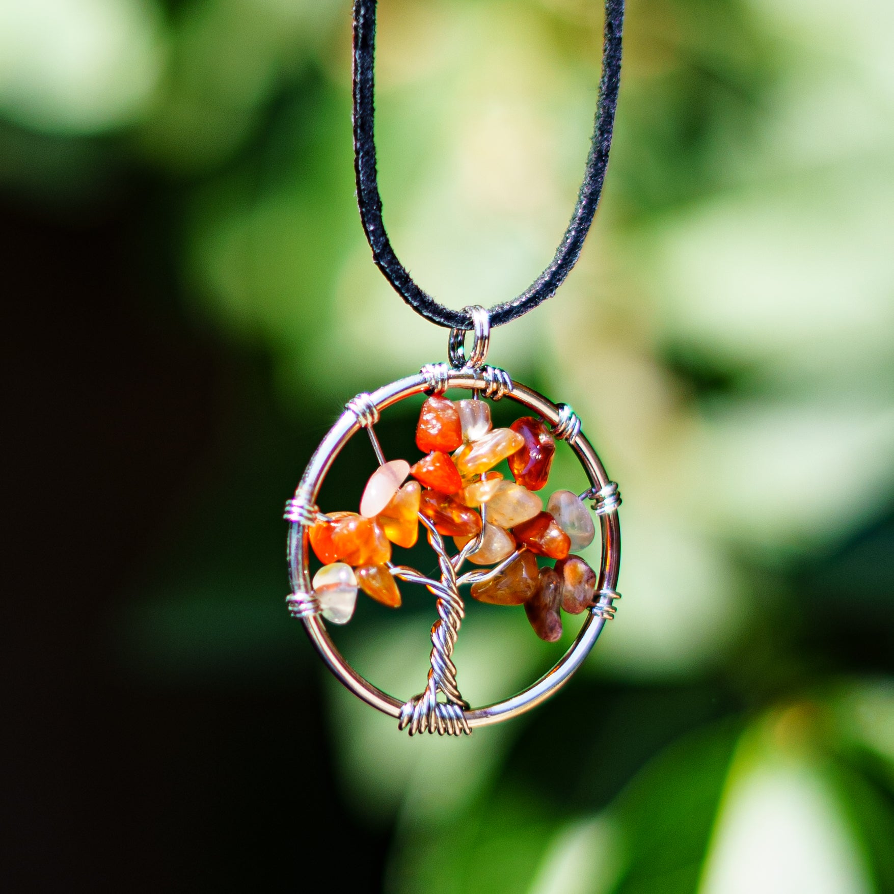 A nyakláncon az élet fája szimbólum ágain Karneol kövek találhatóak, melyek egymást erősítve tökéletes harmóniát alkotnak.
