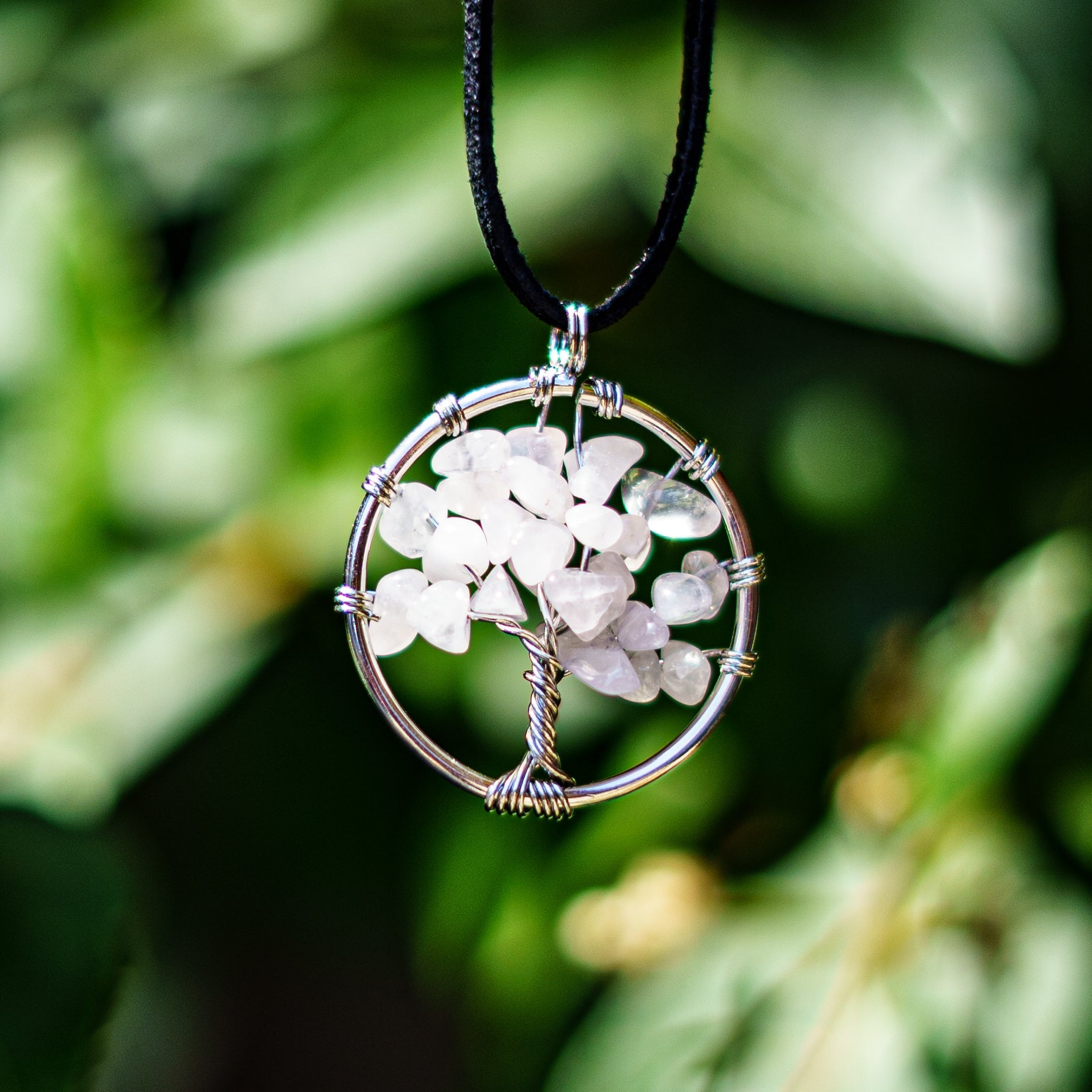 A nyakláncon az élet fája szimbólum ágain Rózsakvarc kövek találhatóak, melyek egymást erősítve tökéletes harmóniát alkotnak.