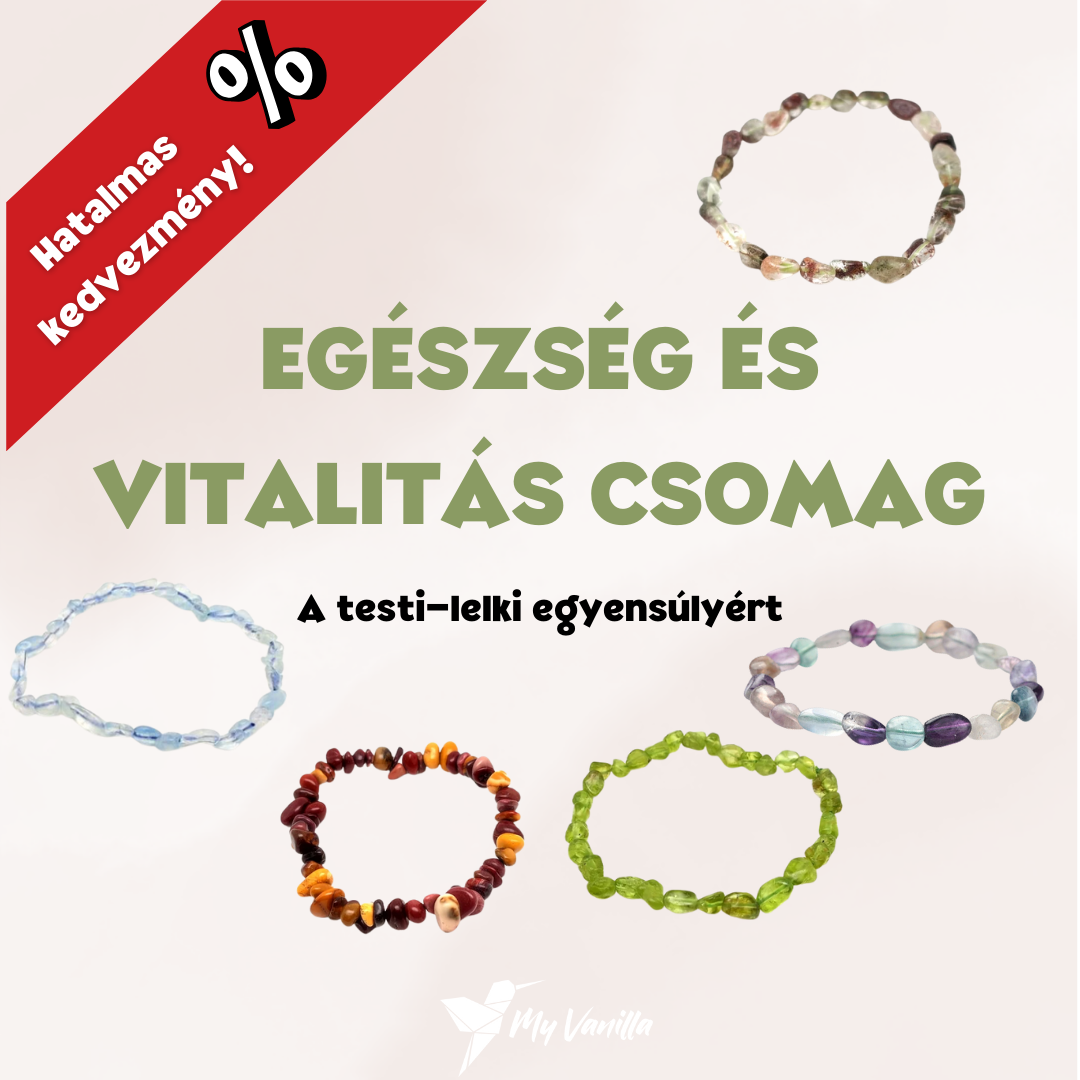 Hozd egyensúlyba testedet és lelkedet, és tapasztald meg a vitalitás és egészség új szintjét a MyVanilla.hu Egészség és Vitalitás Csomagjával! Ezek a különleges ásvány karkötők támogatják az immunrendszeredet, a belső békédet és az energiaszintedet – hogy minden nap feltöltődve, kiegyensúlyozottan indulhass útnak.