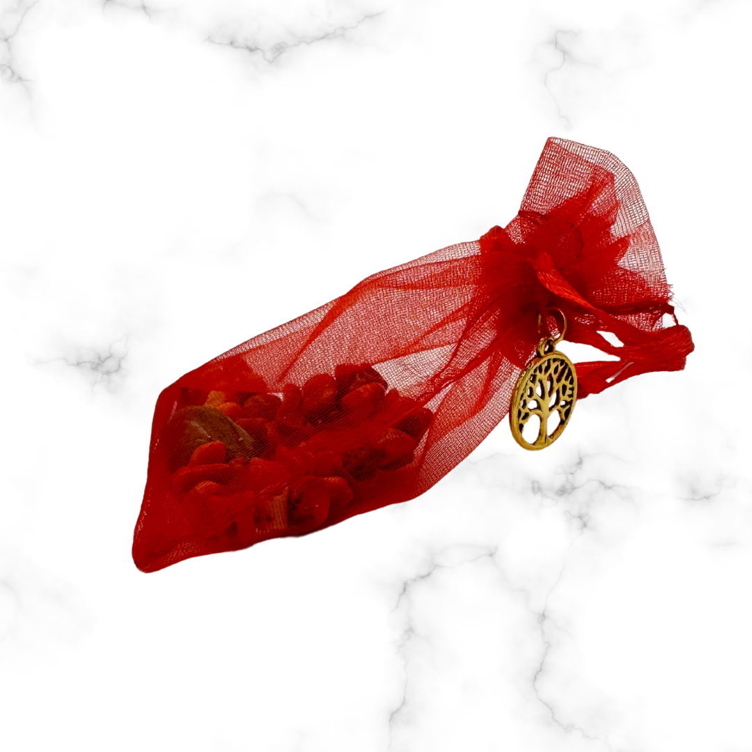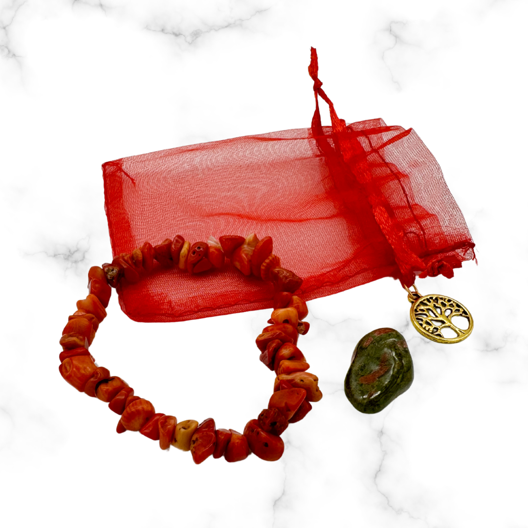 Öngyógyítás Csomag – Korall Karkötő, Unakit Ásvány és Életfa Medál (Piros Tasakban)