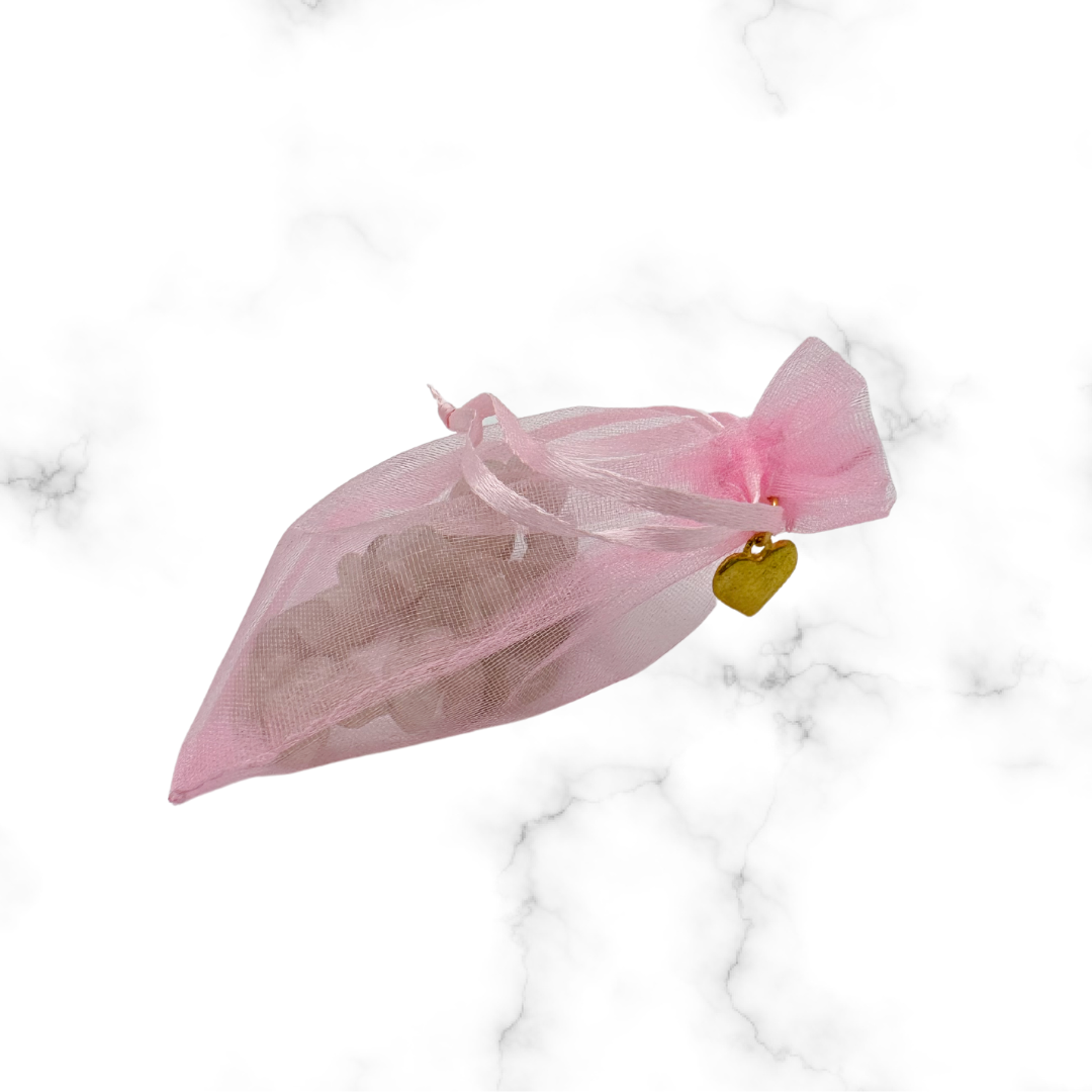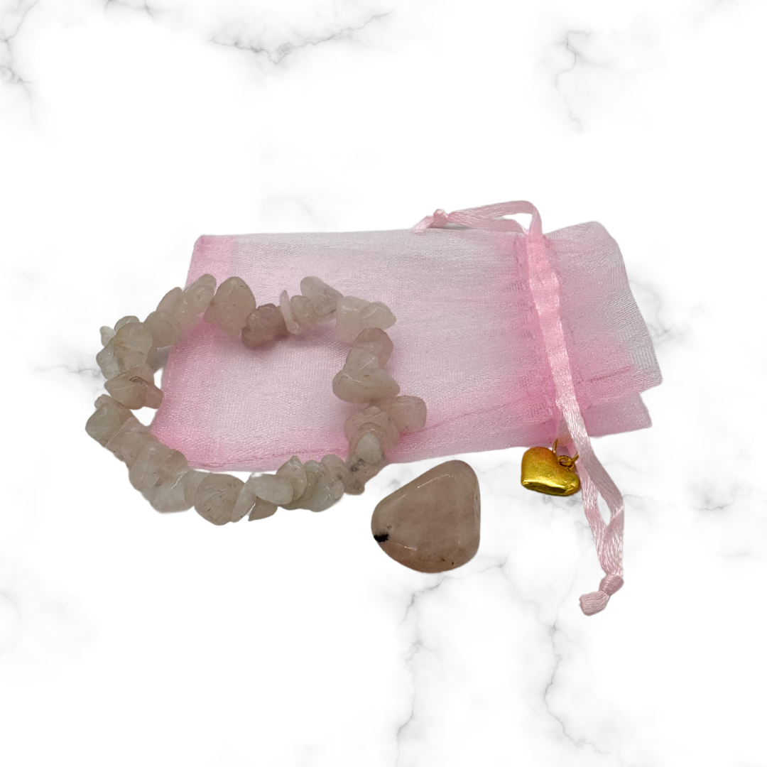 Szeretet és Szerelem Csomag – Rózsakvarc Karkötő, Rózsakvarc Ásvány és Szív Medál (Rózsaszín Tasakban)