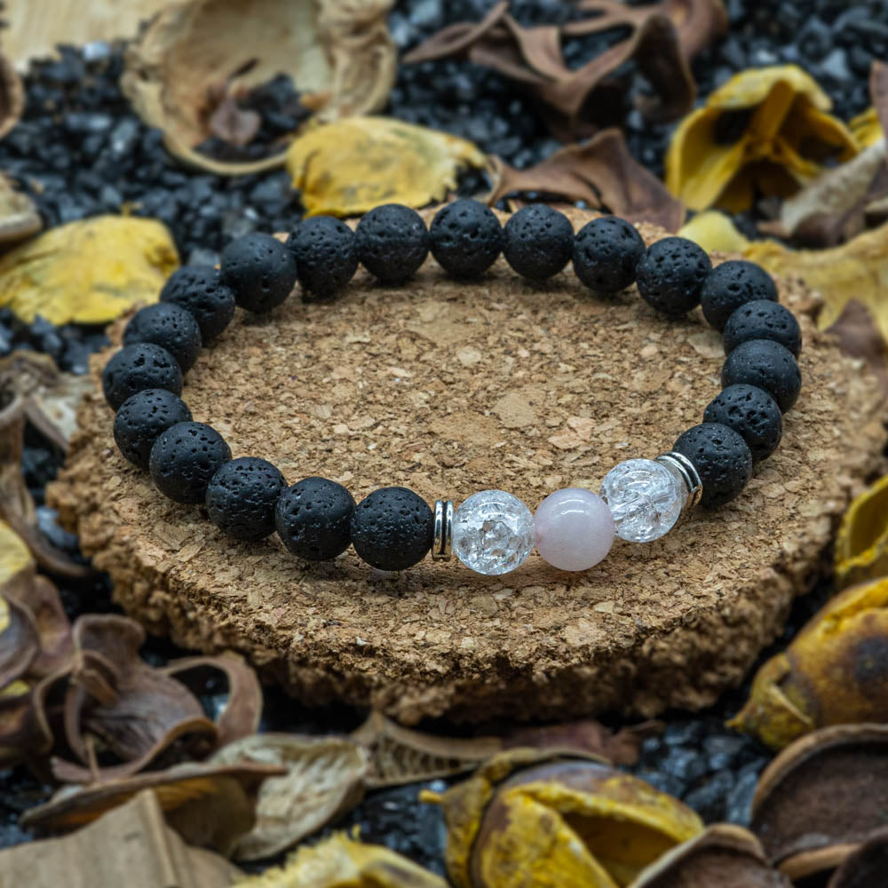 Brățară cu piatră de lavă 2 cristale de stâncă crăpate și 1 cuarț trandafir în mijloc