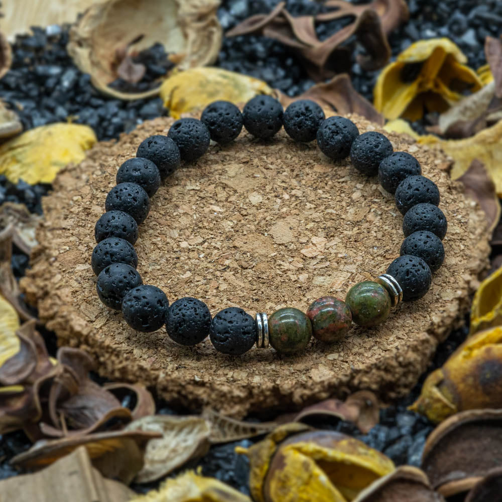 Bratara din piatra de lava cu 3 Unakit Green Jasper